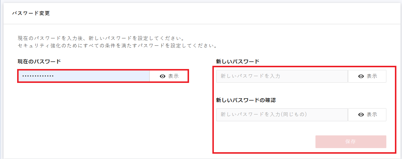 下記の条件に沿って新しいパスワードを設定してください。すべての条件を満たすと「保存」ボタンが有効になります。