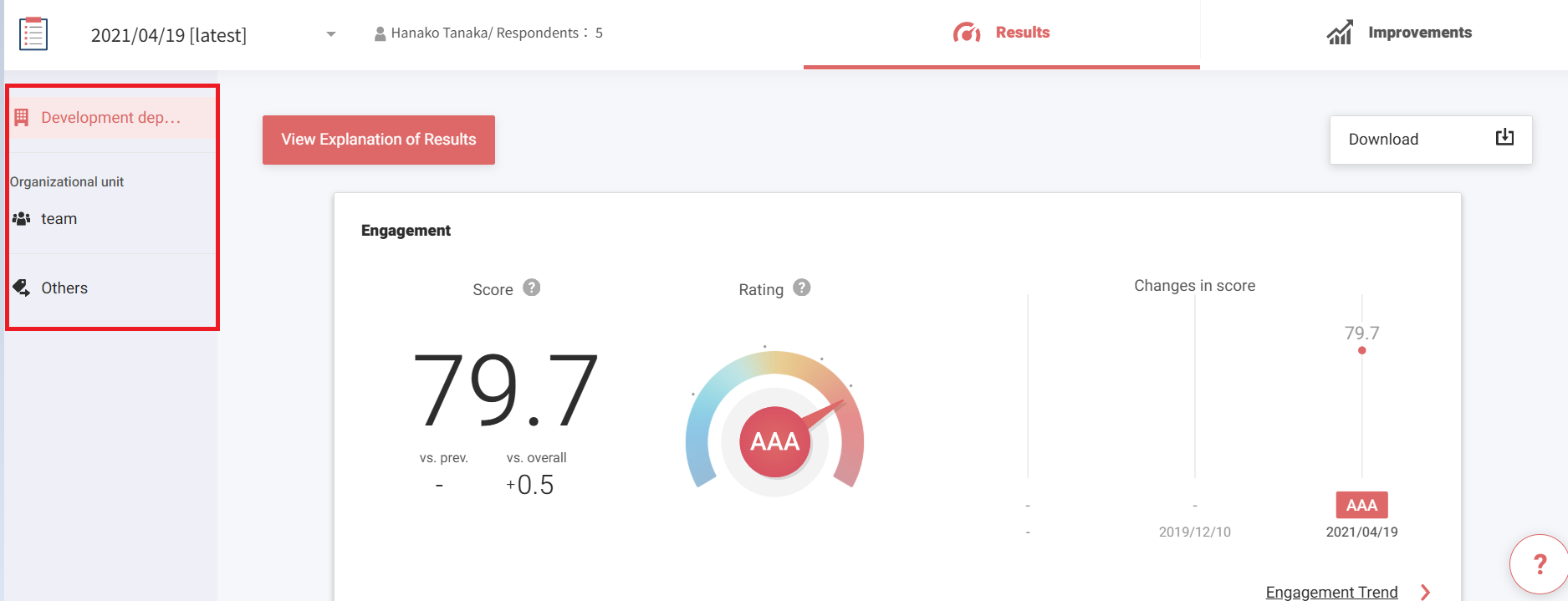 แสดงส่วนต่างของครั้งนี้กับครั้งก่อน อาจไม่สามารถเทียบคะแนนกับครั้งก่อนในแต่ละรายการได้เนื่องจากเนื้อหาที่ตั้งค่าไว้ในการตั้งค่าการดำเนินการ ในกรณีดังกล่าวจะแสดงคะแนนเป็น “-” - ระดับผลกระทบต่อคะแนนการมีส่วนร่วม