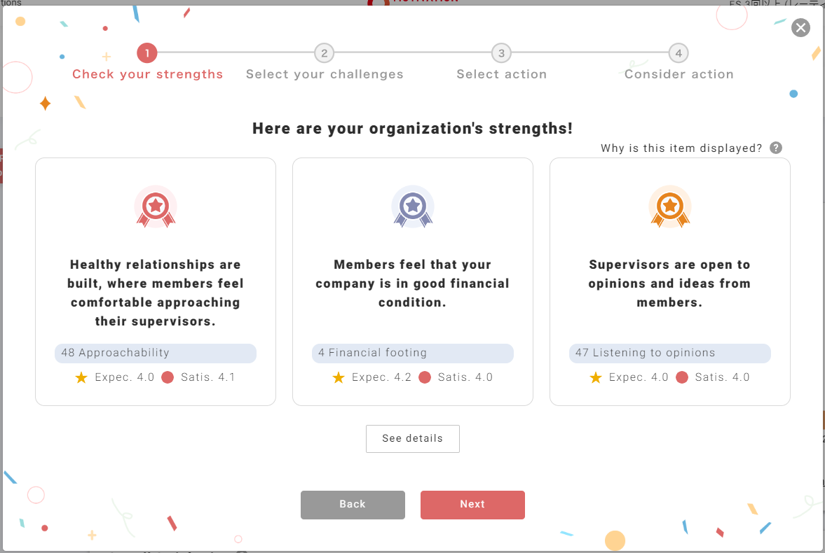 A. 详细的逻辑不便公开。是参考敬业度等级的趋势,对调查结果(期待值与满意度差距大的项目)和得分容易提高的项目进行综合判断。